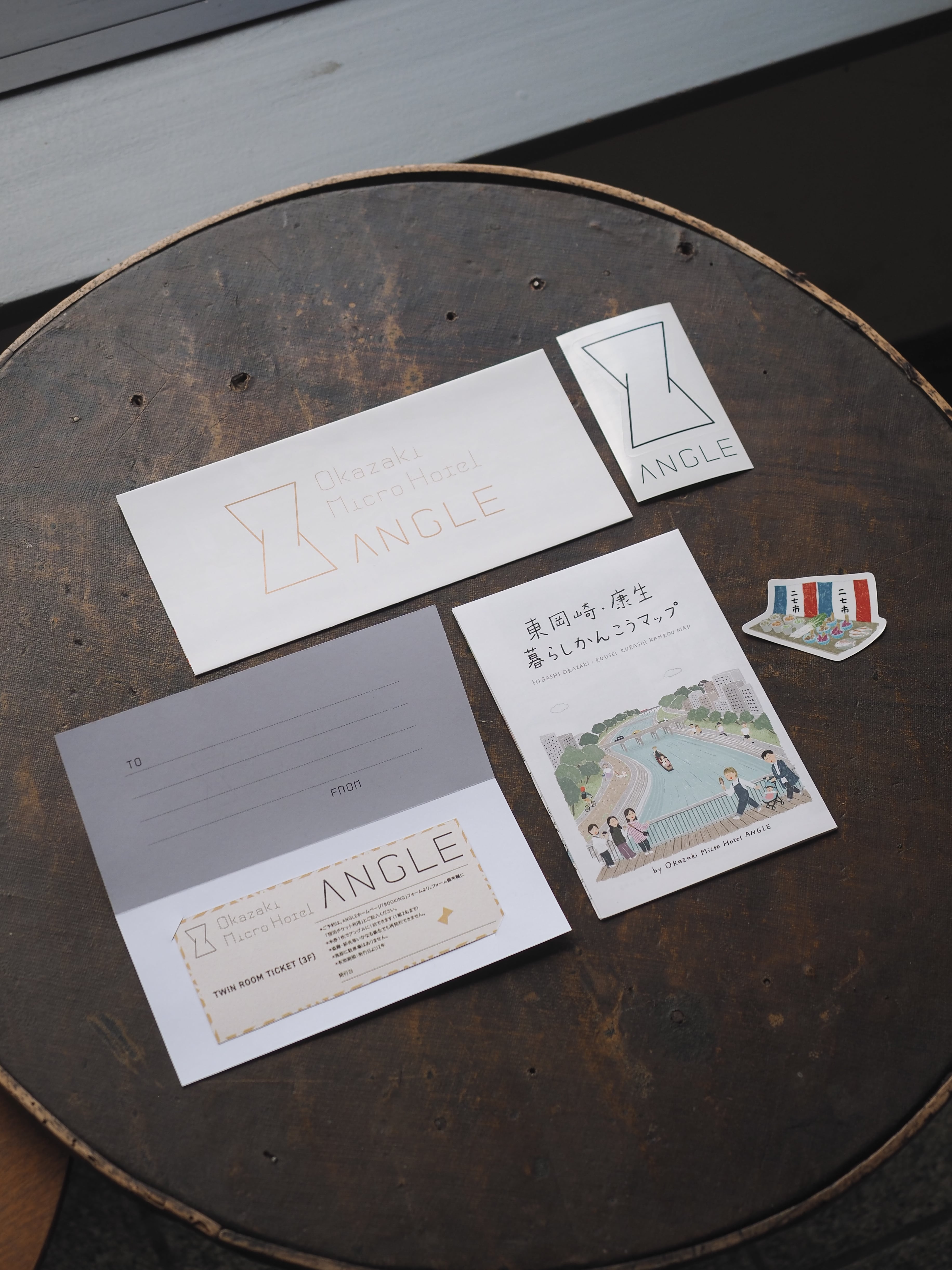 「ベビーシッター付き宿泊プラン」の宿泊チケットと合わせて、アングルがオリジナルで作成しているマップやステッカーなど、“岡崎へいってみたいな”と思っていただけるよう、私たちのこだわりを詰め込んだオリジナルギフトセットです。