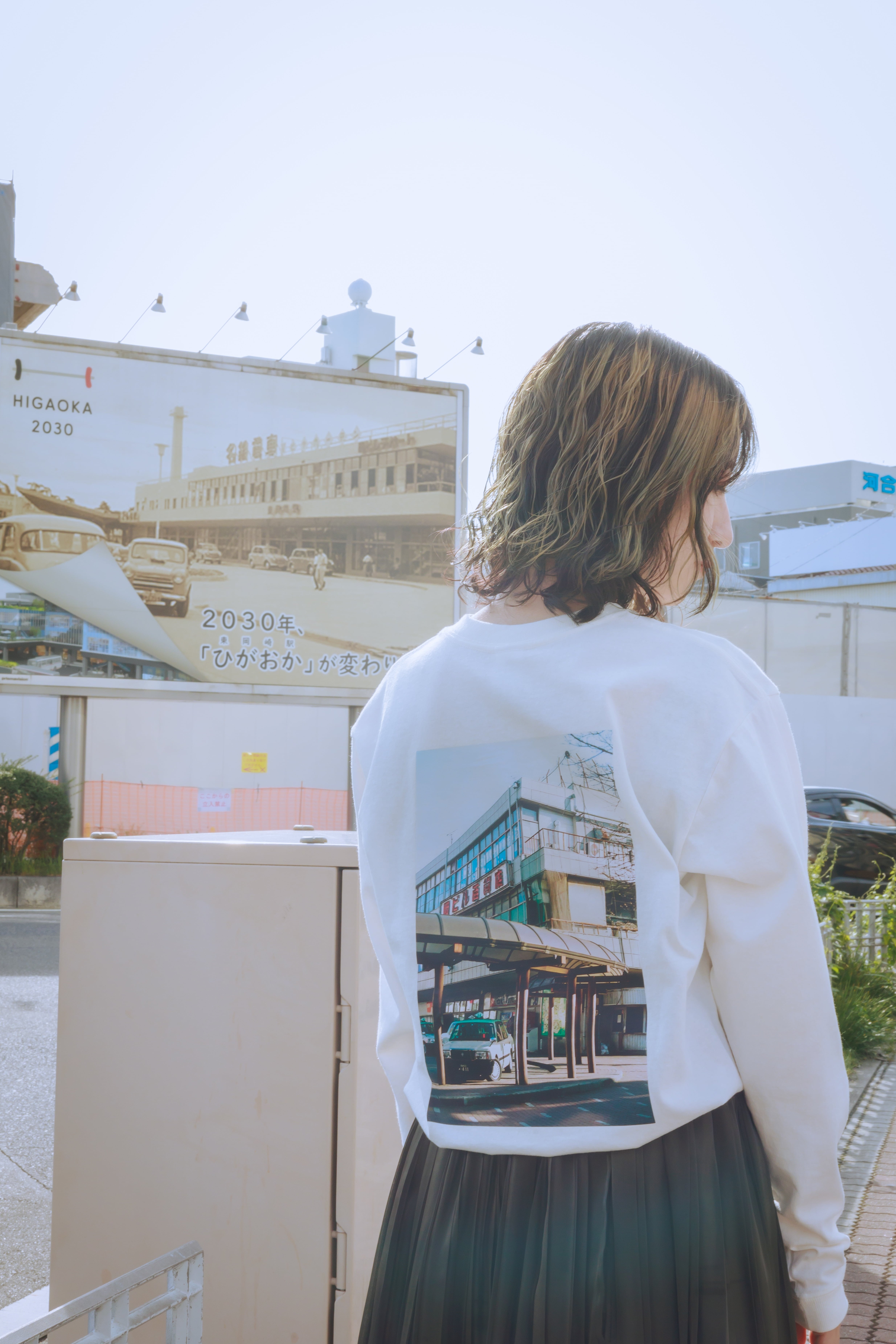 アングルの最寄り駅である東岡崎駅。長年まちの入り口として営業していた「岡ビル百貨店」が駅前のリニューアルに伴い取り壊しに。街の風景を大切にしたいとの思いで、今は見ることのできない景色をバックプリントにしたオリジナルTシャツができました。